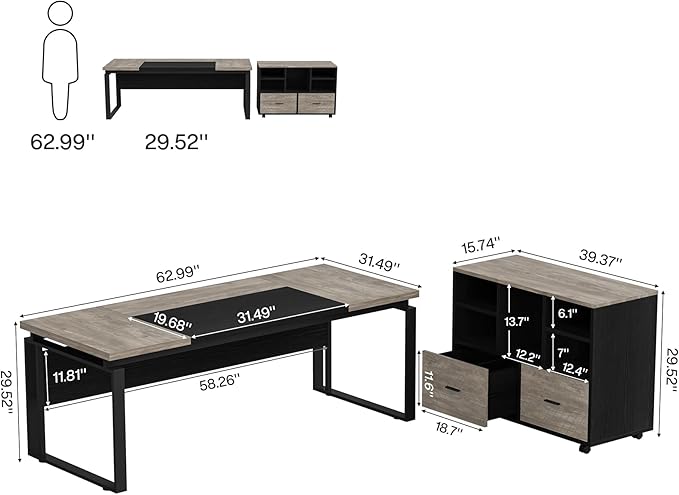 - 【Ample Storage Space】 This 63" desk and 39.4" file cabinet set offers great storage options to keep your office organized. The file cabinet is equipped with 2 drawers, perfect for hanging letter-sized files, along with 5 open shelves to showcase your essentials or decorations.