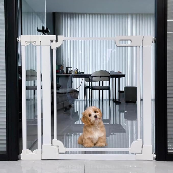 - Safety and versatility: Clear pet gates can be used on stairs, doorways, kitchens and hallways. It stops babies, children or pets from going over and keeps children and pets safe at all times. Our clear baby gates fit openings from 29.52 inches to 37.79 inches, please measure the opening size before purchasing. TIP: Before installation, there will be a gap between the wide latch and the door frame, this is not a defect or a bend. It will be eliminated after installation