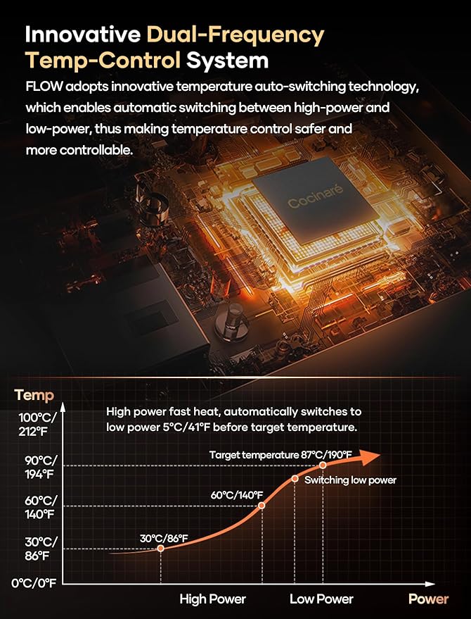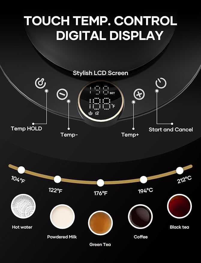 • ±1℉ Temperature Accuracy - The intelligent base's built-in temperature control program. The program will adjust the heating power when the water temp approaches the desired temp according the temp probe detects the temp change.