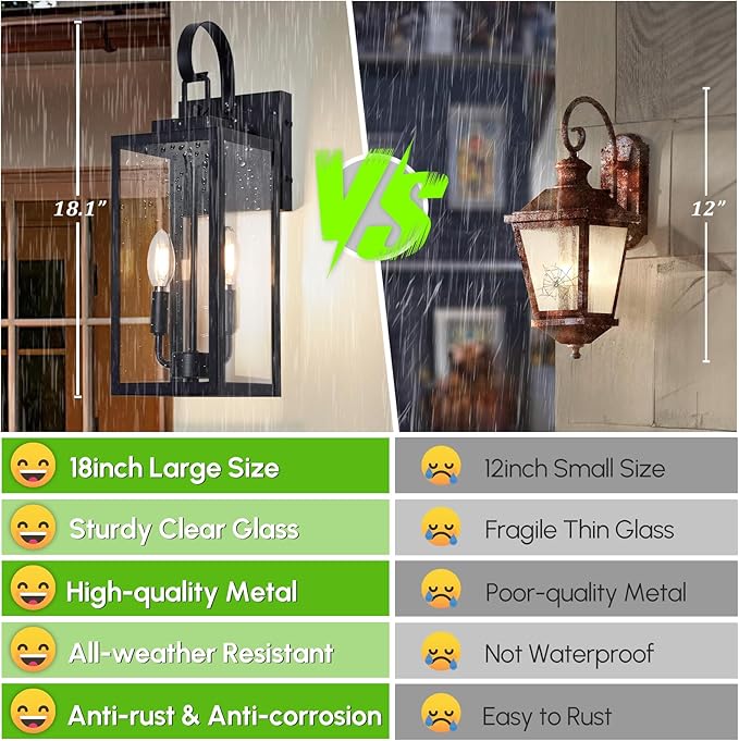 - All-Weather Outdoor Wall Lantern: Our outdoor sconce light is built to last, made with durable metal and tough glass that can withstand any weather condition, from sunny days to snowy nights. Designed with high-quality materials, this outdoor light fixture ensures long-lasting brightness and resistance to rust and corrosion, maintaining its flawless appearance year after year