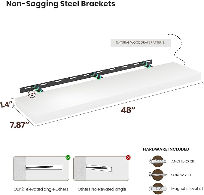 - Premium Wooden Floating Shelves -Unlike others, they are beautifully-finished, fantastic-smelling solid pine,and they are handcrafted out of finest solid pine wood measuring 48" x 8" x 1.38",revealing its own character of knots and natural wood grain, making each ledge a little different but equally stunning.