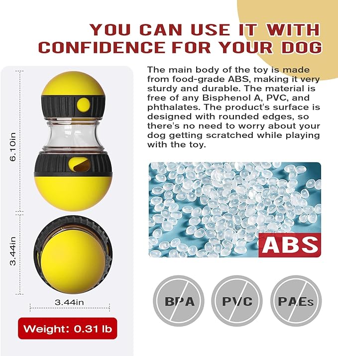 - Interactive Dog Toy: More suitable for boring dog toys at home, our interactive toy has different sized balls on both ends, when you push the toy, it will keep moving, during the movement, the food is dispensed from the adjustable food holes on both sides of the toy.
