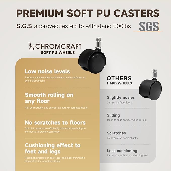 - 【Innovation: Double Wheel Soft Caster】 Innovative use of softer polyurethane double-wheel casters allows for super smooth movement across any floor surface. Unlike the hard surface casters commonly used on most dining chairs, our softer polyurethane casters effectively minimize floor scratches, giving you a smoother and scratch-free experience. Upgrade to Chromcraft; it's easier to move around in your dinette, kitchen, or game room and gentle to your floors.