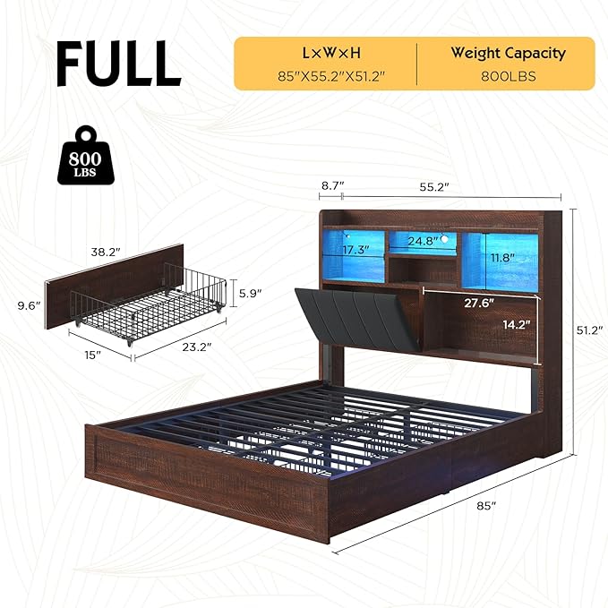 - 【Multi-Functional Storage Space】Wooden Bed frame has 4 under-bed drawers, bookcase headboard with 5 open storage spaces & 2 hidden large spaces. Maximize storage space to easily meet your storage needs