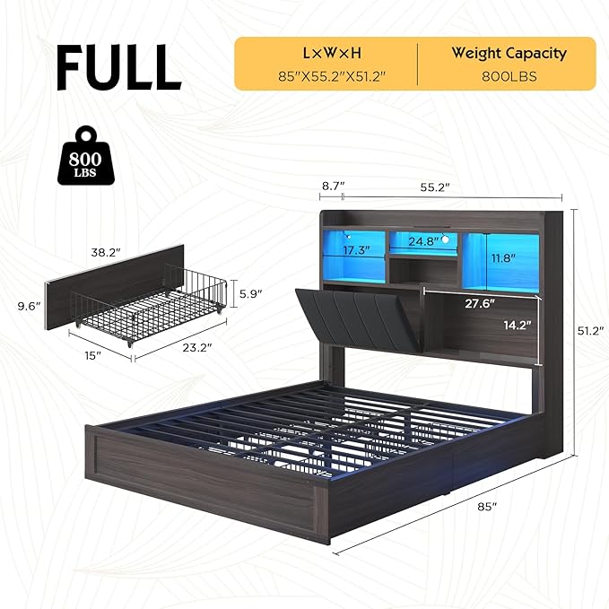 Full Farmhouse Bed Frame with Bookcase Headboard and 4 Drawers, LED Storage Bed with Charging Station & Linen Upholstered, No Box Spring Needed, Black