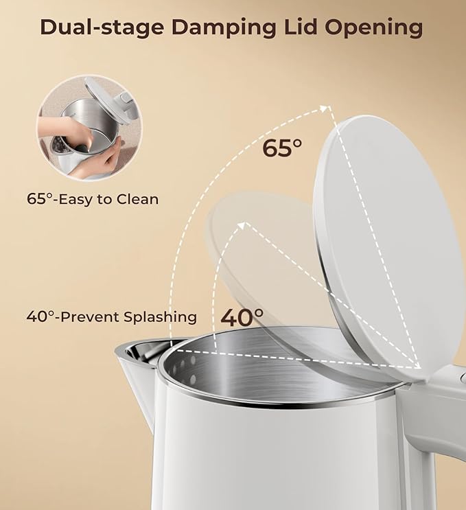 • 【Dual-stage Damping Lid Opening】Press the button of the electric kettle to open the lid to 40° to avoid hot water splashing or steam. Rise the lid to 65° for easy filling and cleaning.