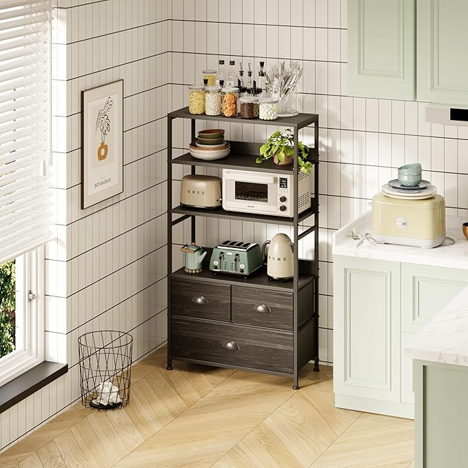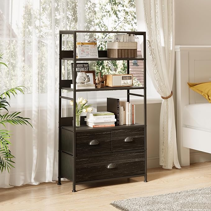 - đăAmple Storage SpaceăThis bookshelf with 3 Fabric Drawer and 4 tier open shelves maximize vertical space, to store your books, artwork, potted plants, and framed family photos and other daily necessities, keeping your room neat and organized.