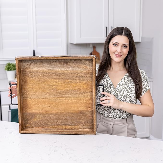 - š EFFORTLESS TRANSPORT ā Featuring sturdy iron handles, this 20" x 20" x 2.5ā rustic wood ottoman tray is easy to carry from kitchen to table, ensuring seamless service during gatherings or daily routines.