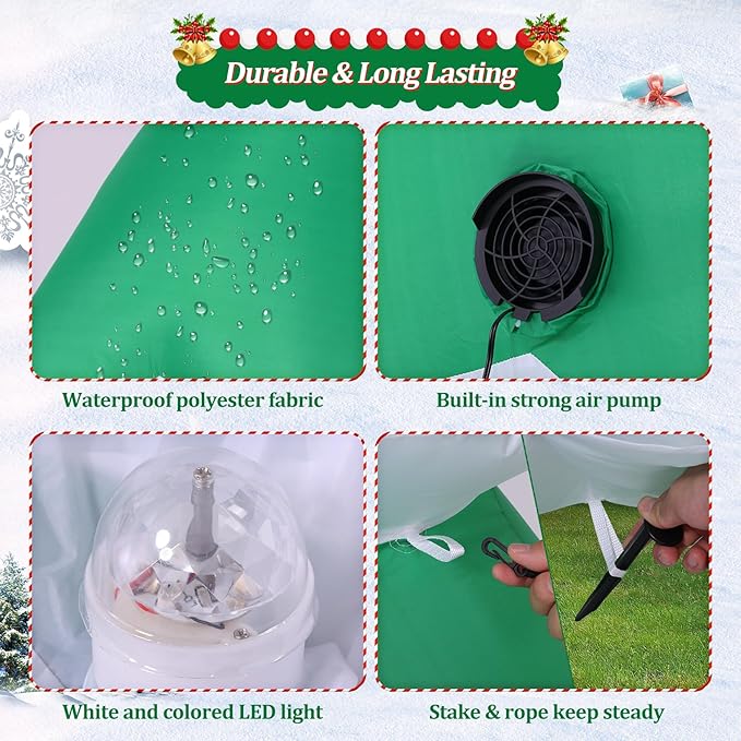 - WEATHER-RESISTANT & LONGER LIFESPAN: This Outdoor Christmas Tree inflatable outdoor is made of durable 210T waterproof umbrella fabric, which is not only very wrinkle-resistant but also not easy to be pierced by sharp and hard objects; The waterproof design ensures it stands strong against snow and wind. Whatβs more, with spraying technology, the vibrant color won't discolor. This makes it the perfect christmas outdoor decoration to your yard, bringing festive cheer to your home year after year.