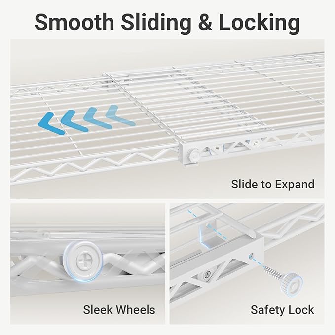 - Flexible Adjustment & Secured Locking: All the clothes rack wire shelves and hanging rods can be lengthened or shortened (24" to 41") based on your needs. They are equipped with secured locking gadgets, eliminating the annoyance of overextending