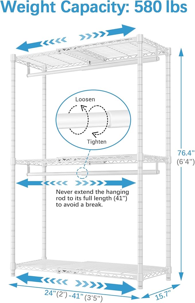 - Dimensions & Load Capacity: (24"-41")W x 15.7"D x 76.4"H, X1 clothing rack maximum load capacity 580 lbs., constructed of high-quality carbon steel, sturdy and reliable, it is long-lasting and features anti-tip devices to prevent unexpected falling