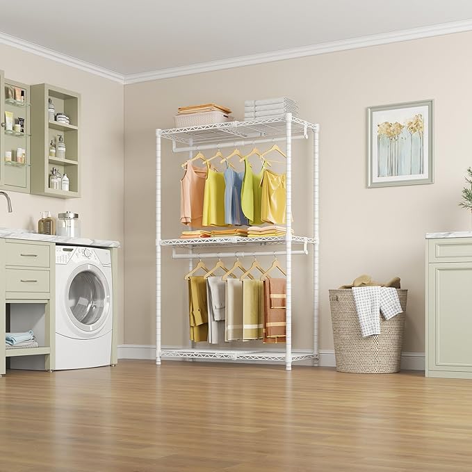 - Multifunctional Garment Rack: The wardrobe rack can be used in multiple types of rooms, suitable for cloakrooms, bedrooms, apartments, school dormitories, and laundry rooms. Shoes can be put on the bottom of the shelf neatly, and clothes can be folded and organized on the shelves