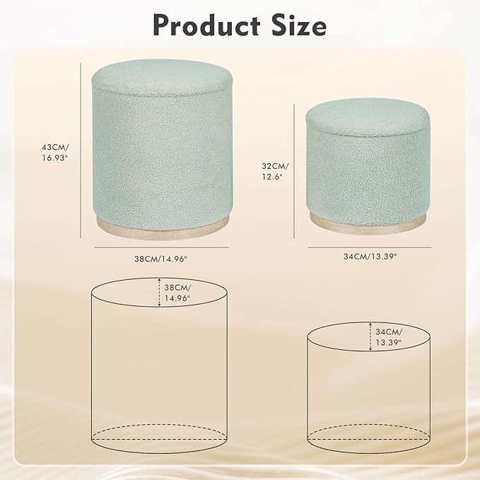 - 【Compact Size】The Velvet Round Ottoman with Storage have 2 sizes: 15"L x 15"W x 17"H (big) 13.4"L x 13.4"W x 12.6"H (small) The nest packing very suitable for space saving when not in us.This round ottoman with storage are assemble free and ready to use.