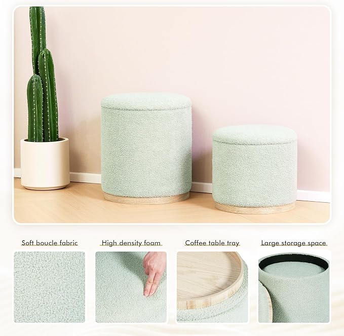 PINPLUS Round Ottoman with Storage Set of 2, Storage Ottoman with Tray, Teddy Velvet Ottoman Storage Modern Multifunctional Foot Rest Stool for Bedroom, Living Room, Dorm (Green)