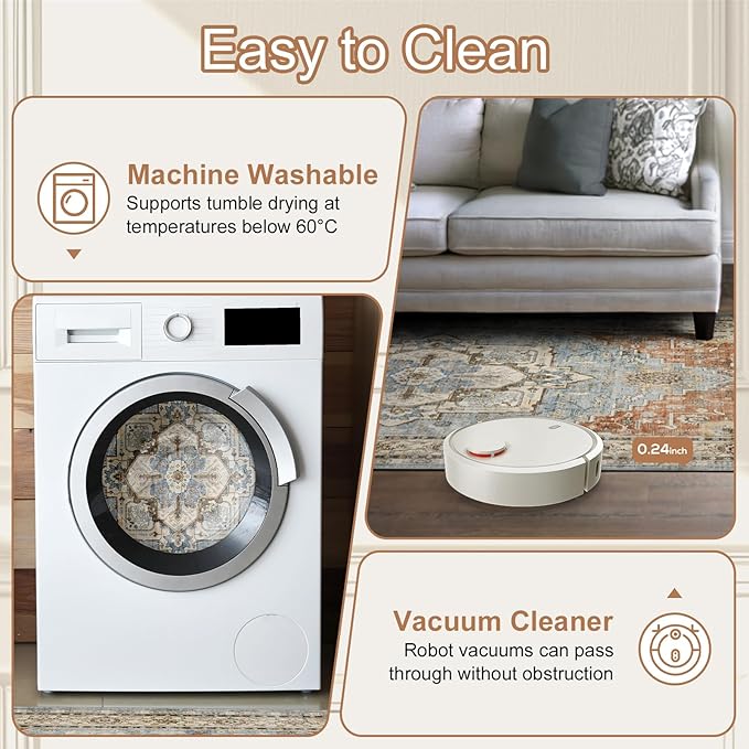 - 【Stain-Resistant, Durable & Low Maintenance】This indoor rug boasts strong stain resistance, and the unique color combinations of its vintage pattern can hide daily stains. Even if you spill coffee or soup, simply wipe it off with a paper towel for easy cleanup. Thanks to fine stitching and reinforced edges, the rug is very durable, shedding-free, and it can accompany you and your family for many years