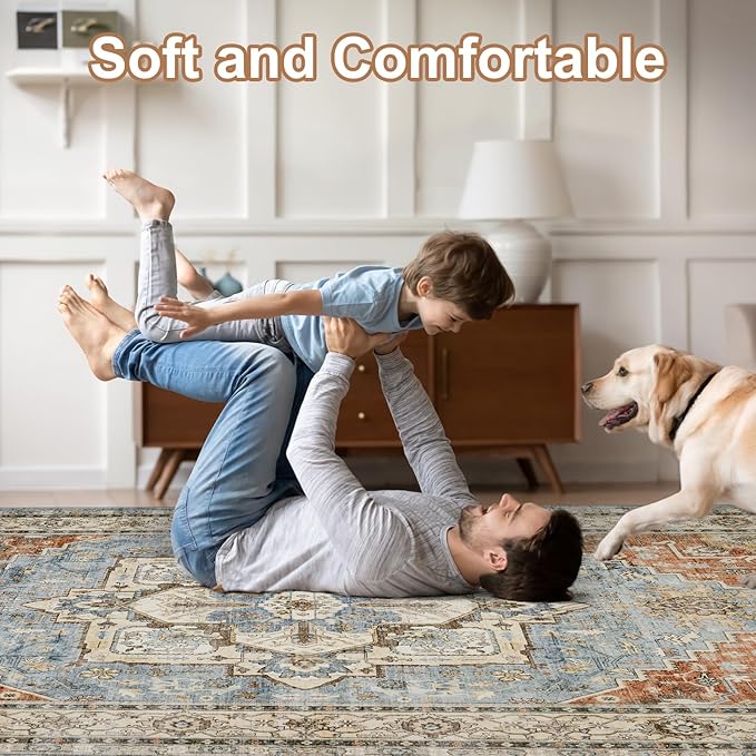 Area Rugs for Living Room 6x9 - Machine Washable Vintage Oriental Soft Rug, Low Pile Thin Floor Carpet with Non Slip Backing for Bedroom, Dorm, Under Dining Room Table, Indoor House, Office Decor
