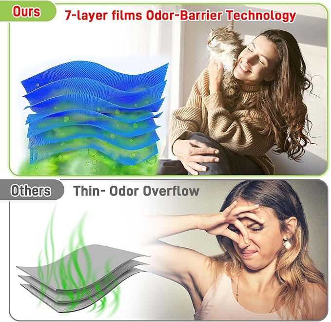 - Max Odor Lock: Our upgrade cat refill bags adopted 7-layer films Odor-Barrier Technology, it helps effectively trap the smell of soiled litter for up to two weeks. Even if you miss trash day, you won't have to worry about unpleasant odors.