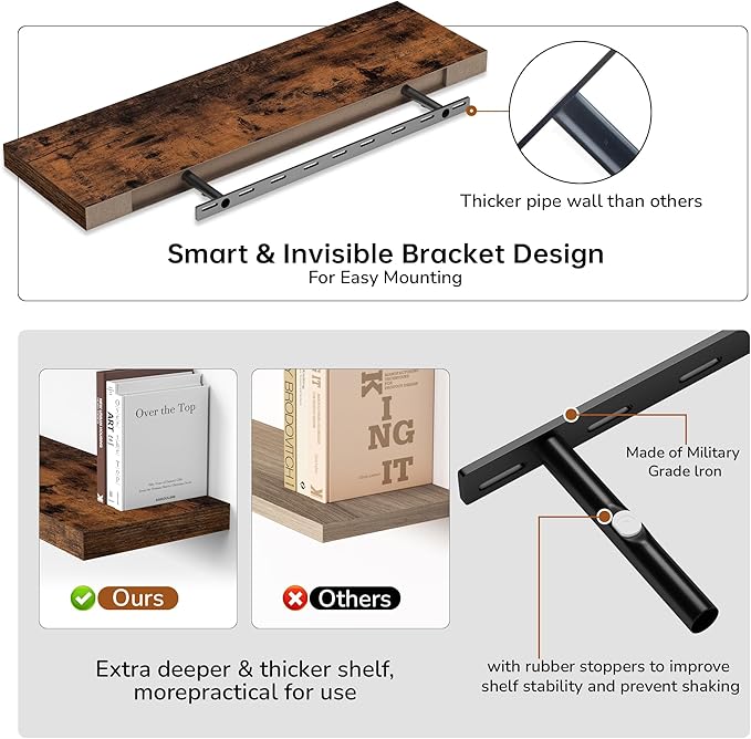 - Rustic & Modern Wooden Floating Shelves: Crafted from durable engineered wood with a realistic wood grain finish, our floating shelves offer the perfect blend of rustic charm and modern minimalism. The matte surface enhances its sleek, contemporary look, making it ideal for any room in your home. Whether you want to display your collection or organize essentials, these wall shelves seamlessly integrate with any décor and can be mounted on any wall to elevate your living space.