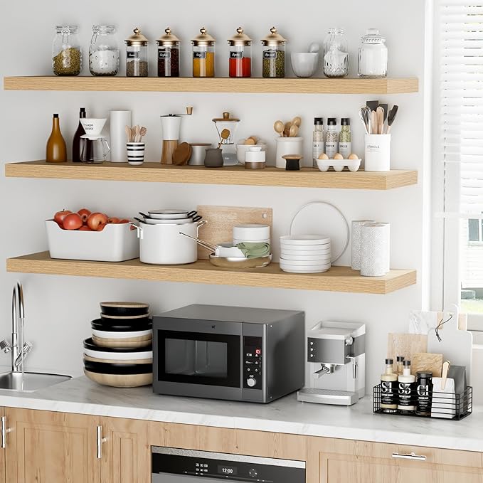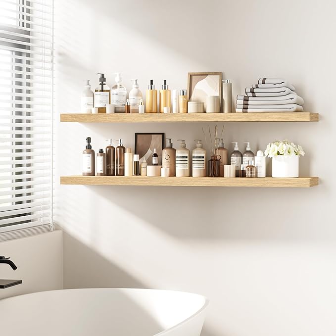 - Versatile & Multi-Scene Functionality: Our floating shelves are available in a variety of sizes and thicknesses, allowing you to choose the perfect fit for your space. Use them in the bathroom to store beauty products, hair care items. In the bedroom, they can hold books, cosmetics, and personal items. In the kitchen, they’re perfect for spices, jars, or small utensils. Or display photo frames, trophies, or collections in the living room. These shelves efficiently use wall space to create a tidier, more spacious feel in any room.