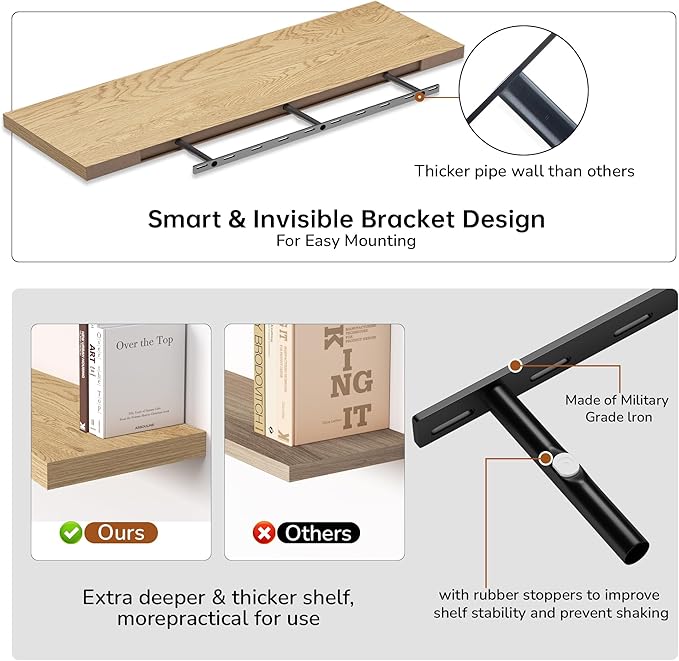- Easy to Assemble & Install: Each shelf comes with everything you need for quick and easy assembly: durable steel invisible brackets, toggle bolts for drywall, and a straightforward instruction manual. With just one or two boards and a few screws, you can have the shelf up in no time. The included step-by-step instructions make the installation process hassle-free, and our customer support team is always available if you need assistance.