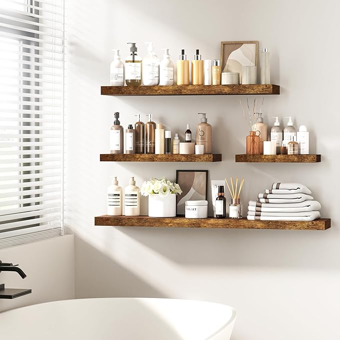 - Versatile & Multi-Scene Functionality: Our floating shelves are available in a variety of sizes and thicknesses, allowing you to choose the perfect fit for your space. Use them in the bathroom to store beauty products, hair care items. In the bedroom, they can hold books, cosmetics, and personal items. In the kitchen, they’re perfect for spices, jars, or small utensils. Or display photo frames, trophies, or collections in the living room. These shelves efficiently use wall space to create a tidier, more spacious feel in any room.