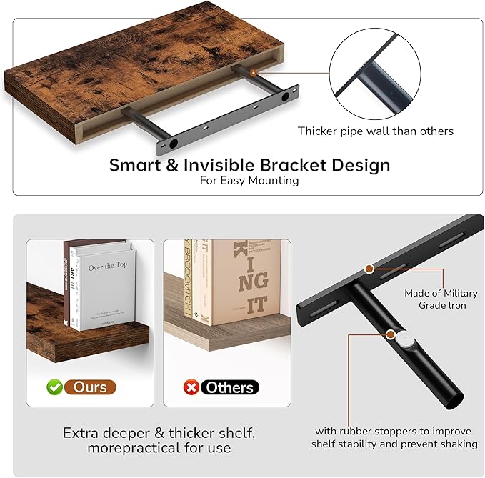- Extra Deeper & Thicker - Each board measures 16"W x 8"D x 1.5"H. Extra deeper and thicker design in order to bring maximizes storage space and weight capacity, even hold up to 30 lb each. This floating shelf taking up zero square feet, reduces clutter and highlights décor in compact spaces.