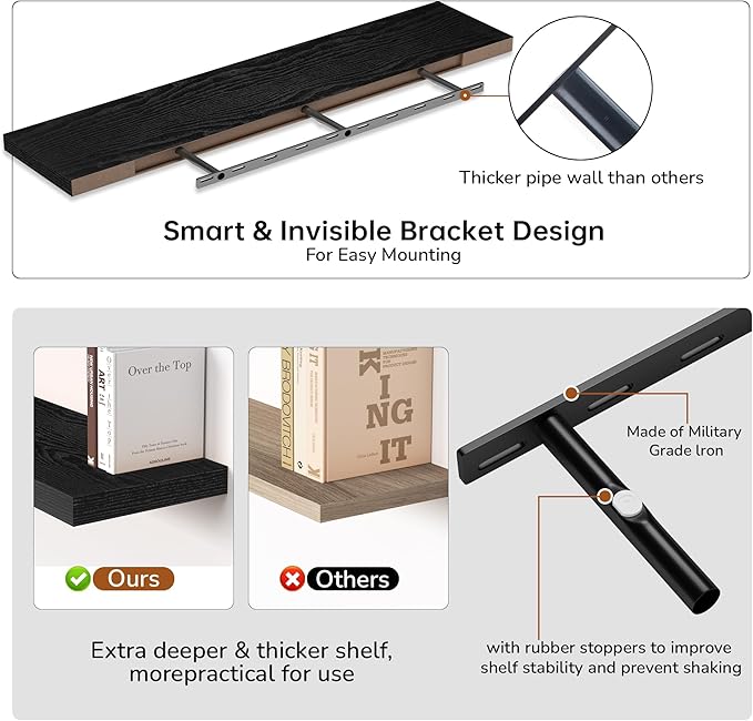 - Extra Deeper & Thicker - Each board measures 55"W x 9.3"D x 1.8"H. Extra deeper and thicker design in order to bring maximizes storage space and weight capacity, even hold up to 80 lb each. This floating shelf taking up zero square feet, reduces clutter and highlights décor in compact spaces.