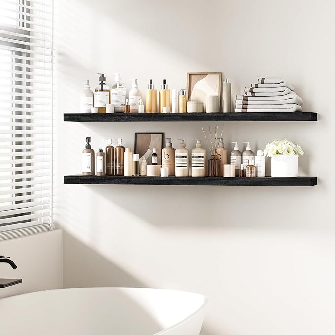 - Versatile & Multi-Scene Functionality: Our floating shelves are available in a variety of sizes and thicknesses, allowing you to choose the perfect fit for your space. Use them in the bathroom to store beauty products, hair care items. In the bedroom, they can hold books, cosmetics, and personal items. In the kitchen, they’re perfect for spices, jars, or small utensils. Or display photo frames, trophies, or collections in the living room. These shelves efficiently use wall space to create a tidier, more spacious feel in any room.