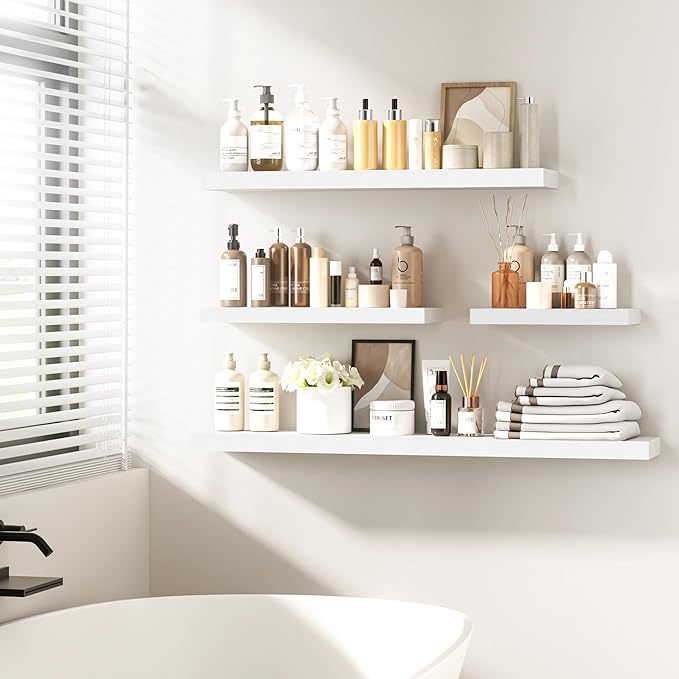 - Versatile & Multi-Scene Functionality: Our floating shelves are available in a variety of sizes and thicknesses, allowing you to choose the perfect fit for your space. Use them in the bathroom to store beauty products, hair care items. In the bedroom, they can hold books, cosmetics, and personal items. In the kitchen, they’re perfect for spices, jars, or small utensils. Or display photo frames, trophies, or collections in the living room. These shelves efficiently use wall space to create a tidier, more spacious feel in any room.