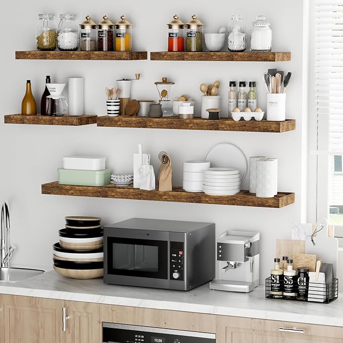 - Rustic & Modern Wooden Floating Shelves: Crafted from durable engineered wood with a realistic wood grain finish, our floating shelves offer the perfect blend of rustic charm and modern minimalism. The matte surface enhances its sleek, contemporary look, making it ideal for any room in your home. Whether you want to display your collection or organize essentials, these wall shelves seamlessly integrate with any décor and can be mounted on any wall to elevate your living space.
