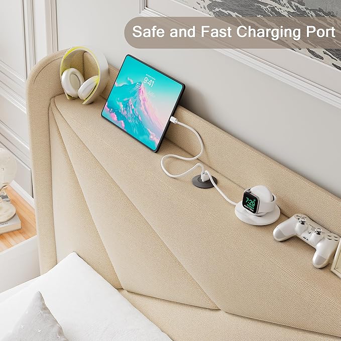 Twin Size Upholstered Bed Frame with Charging Station, Platform Bed Frame with Storage Headboard, Solid Wood Slats Support, No Box Spring Needed, Beige