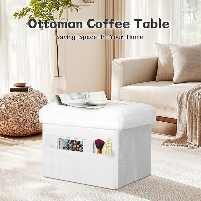 Storage Ottoman Cube, Small Ottoman with Storage with Thicker Furry Padded Seat. Folding Soft Fur Foot Rest Stool for Living Room Bedroom, Holds Up to 300 lbs, 17x13x13IN (White)
