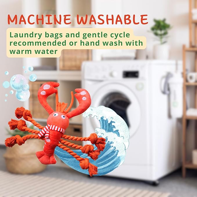 - đăRope Dog Toy for Entertainmentă This stuffed lobster toy features six tough handmade cotton rope legs and Christmas scarf in a unique design that encourages interactive play with your furry friendâperfect for reducing stress and creating lasting memories.