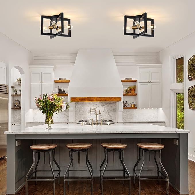 - π 15" MODERN CEILING LIGHT FIXTURE β Featuring a minimalist open-frame design with black square frames and brass accents, this black and gold light fixture provides a bold yet elegant touch to modern interiors. Its intersecting square structure adds depth and visual interest, making it a standout choice for industrial lofts, streamlined minimalist spaces, or rooms seeking modern elegance. Perfect as a dining room light fixture, kitchen lighting fixtures ceiling, or light fixtures ceiling mount, this semi flush mount ceiling light fixture adapts beautifully to any style