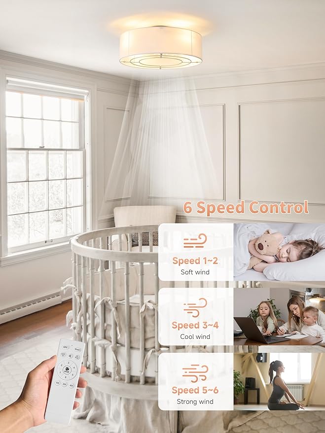 Low Profile Ceiling Fans with Lights, 20" Flush Mount Ceiling Fan with Light, Boho Bladeless with 6 Speeds, Rattan Remote Control for Bedroom, Nursery, Living Room