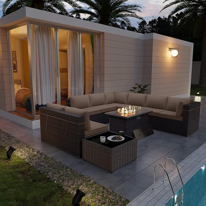 Kurapika 10 Pieces Patio Furniture Set, Rattan Wicker Outdoor Conversation Sets w/43in Propane Fire Pit Table and 4 Inch Cushion(Sand)