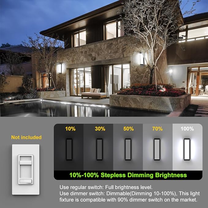 - 【10%-100% Brightness Dimming Wall Light】The Dimmable outdoor modern wall sconce compatible with most LED dimmers on the market, (Not included), allows you to control LED output intensity to achieve optimum lighting effect to fit your decor,this outdoor wall light achieves 3w-30w power output.