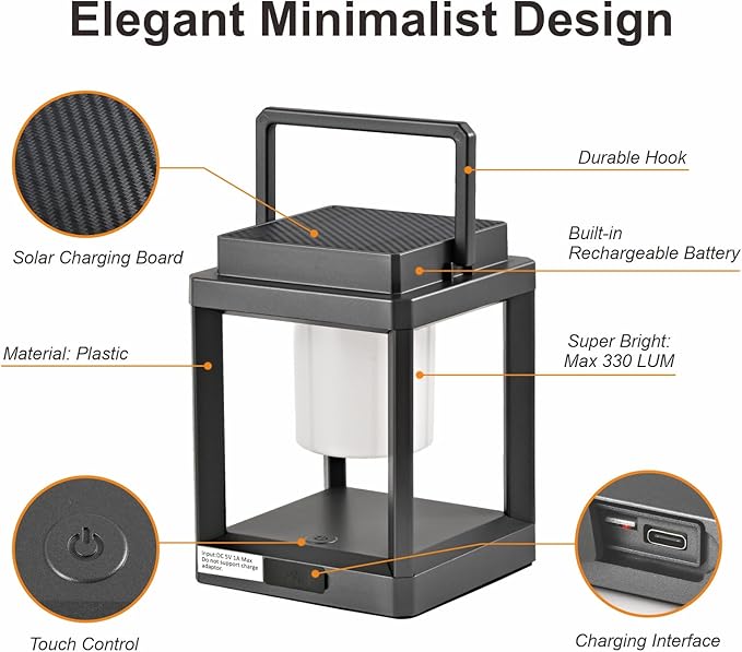 - Easy to Use & Safe: Table light with 3 modes: ① 35 LUM; ② 140 LUM; ③ 330 LUM. Just touch the switch button to choose the brightness from dim nursing light to bright ambient light according to your idea. The simple operation is suitable for more people, such as the elderly, children, and so on. The integrated touch switch fits perfectly with the body, is waterproof, does not seep water, and can control the outdoor lantern easily and agilely on rainy days, and is very safe to use