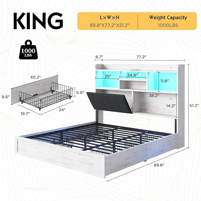 King Farmhouse Bed Frame with Bookcase Headboard and 4 Drawers, LED Storage Bed with Charging Station & Linen Upholstered, No Box Spring Needed, Distressed White