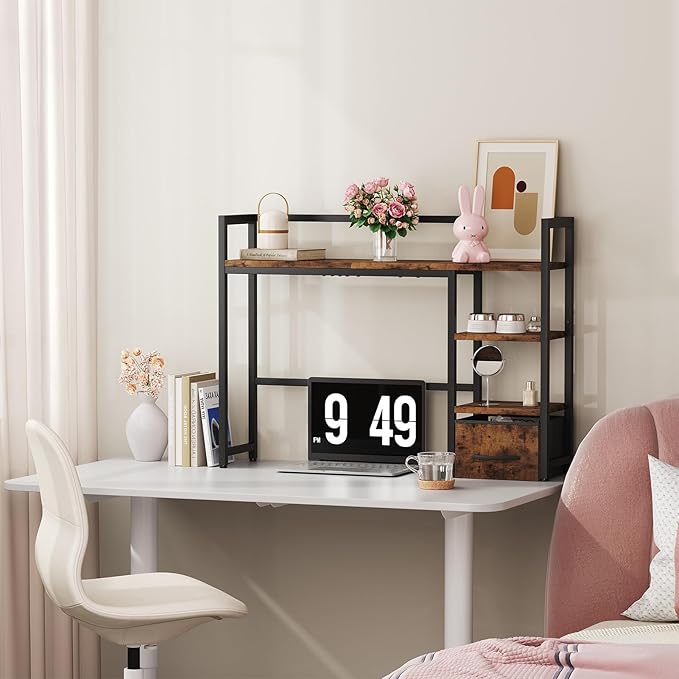 - 【A Powerful Desk Hutch】 This desktop bookshelf features a 4 tier shelf design that maximizes vertical space to provide ample storage space. It features 3 compartments for easy categorization and organization of your items, and also comes with additional fabric drawers at the bottom for storing smaller or personal items, so you can keep your items neatly organized and within reach