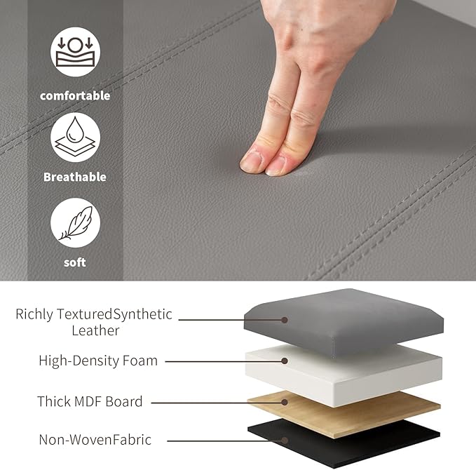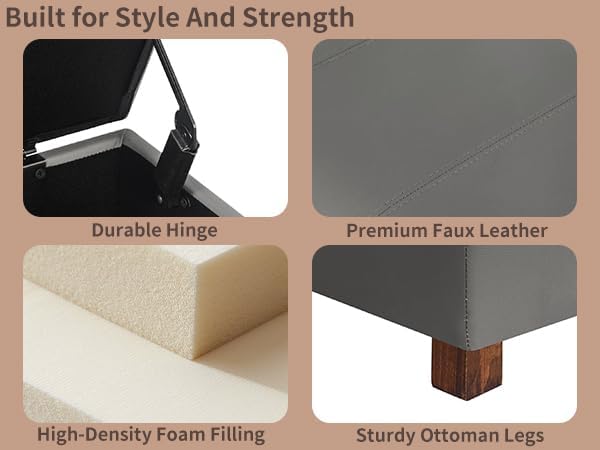 - Durable Elegant and Comfortable:This bench with storage delivers the perfect blend of comfort and durability-Soft synthetic leather paired with high-resilience foam maintains its comfort for years, while the sturdy solid wood frame and thickened support legs reliably support up to 330 pounds. Whether serving as a living room centerpiece, bedroom accent, or home office organizer, this ottoman bench effortlessly combines style and functionality wherever you place it.