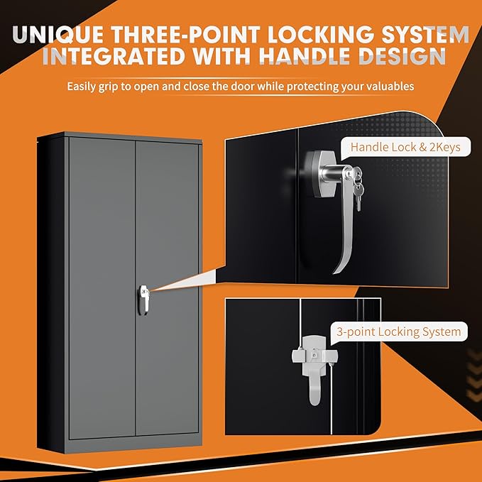 - 【Durable Metal Material】This black storage cabinet distinguishes itself with its robustness.The storage cabinet with doors is constructed from robust cold-rolled steel sheet, an advanced surface treatment process on the surface to give it durable properties. The tall storage cabinet not only ensures durability but also elevates the aesthetic of any room with its chic white finish.