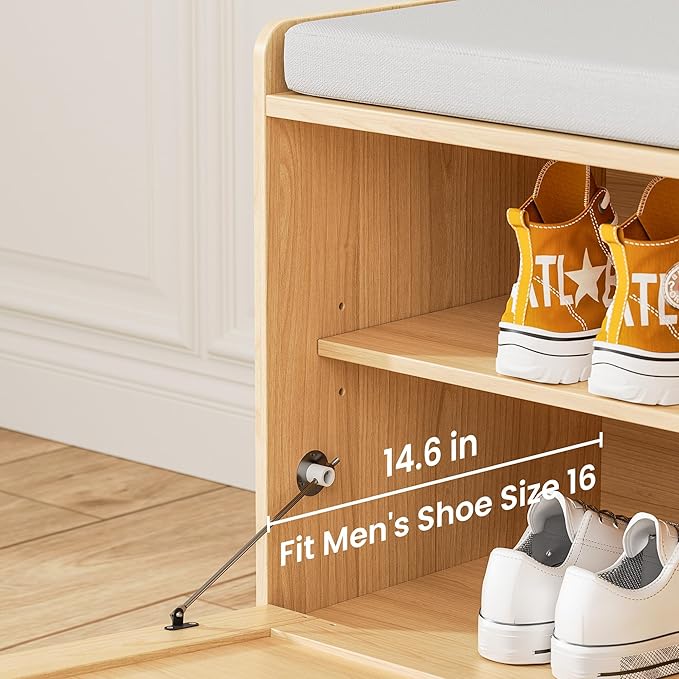 - Convenient Storage: Overall Dimension of the Small Bench: 43.3" W x 15.7" D x 20.9" H. The entry way bench features a pull-down door design for easy access to your shoes, keeping them organized. The shoe rack bench helps maintain a clutter-free space while adding a touch of style to your entryway.