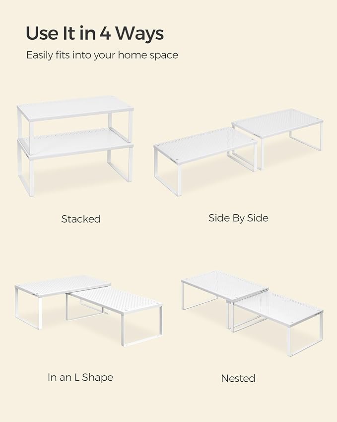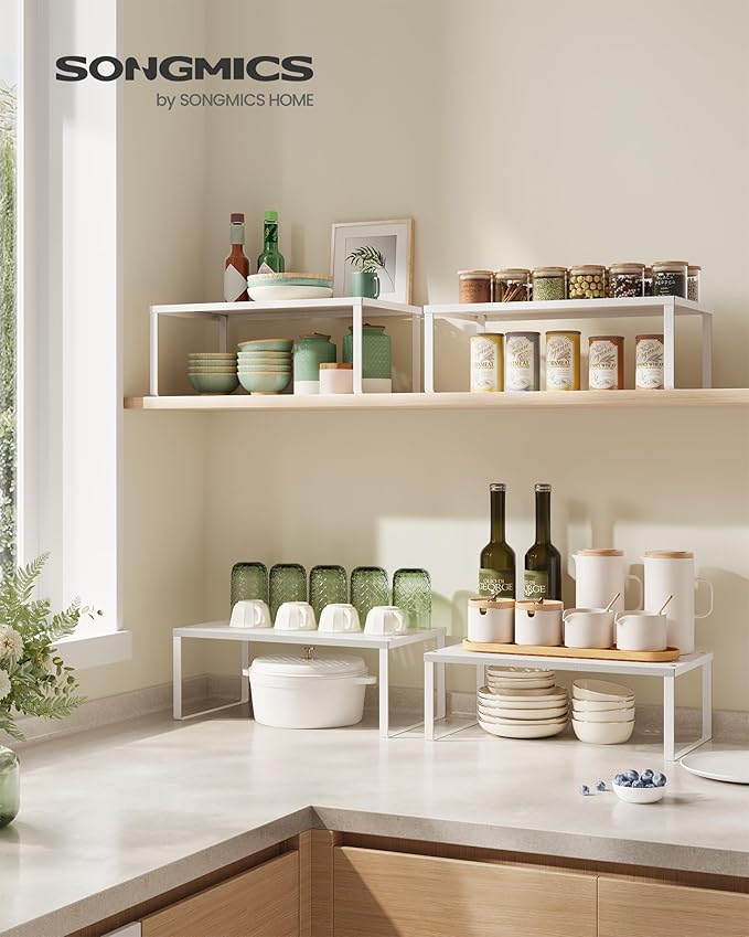 SONGMICS Spice Racks, Set of 2 Metal Cabinet Shelf Organizers, Countertop Organizers, Shelf Risers, Stackable, Expandable, White UKCS401W01