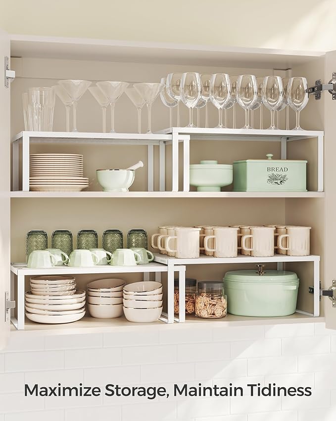 - [Maximize Your Storage] If you have a large cupboard but your items still have nowhere to go, try this set of 2 cabinet organizers—it takes full use of the vertical space and doubles your storage space