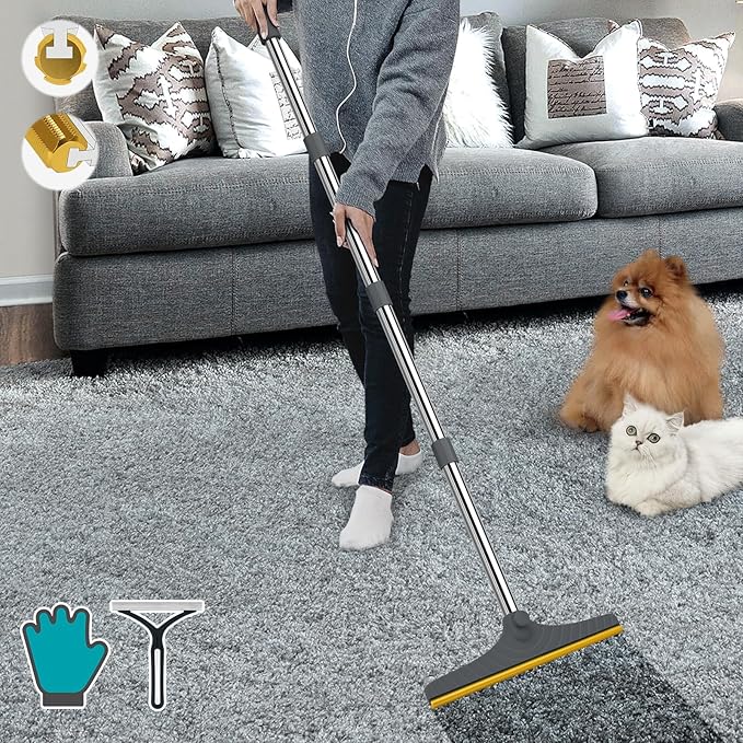 - Much Longer Handle Reaches Deep & Remove it All: The handle of the dog hair remover, composed of a session of 4 pieces of high-quality steel sections, is adjustable in length ranging from 31 to 60 inches. With its 60” extra long handle , the pet cat dog hair broom for carpet reaches even the most embedded fur & lint in a single swipe.