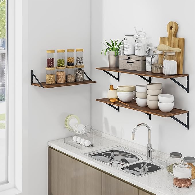 - [Large Capacity Floating Shelves] - Our wall shelves are 24" long x 12" deep, providing ample storage or display space for your kitchen, living room, bedroom, bathroom, laundry room, and more. With such a large space, you can place many items like books, collectibles, plants, crafts, photos, laundry detergent, etc. Our shelf can even be used as a bookshelf or a nightstand. Let our shelves decorate every corner of your home!