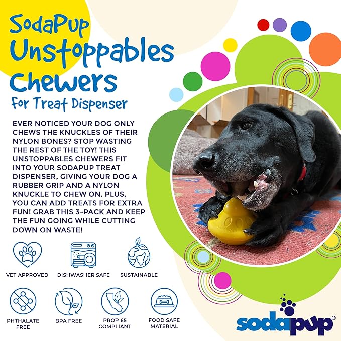 - INSERTS FOR SODAPUP TREAT DISPENSERS – Designed to reduce waste, these nylon Unstoppables Chewers fit perfectly into SodaPup treat dispensers. Your dog gets a durable rubber grip and a tasty chewing experience. Comes in a 3-pack. Size 3.5” x 1.5”.
