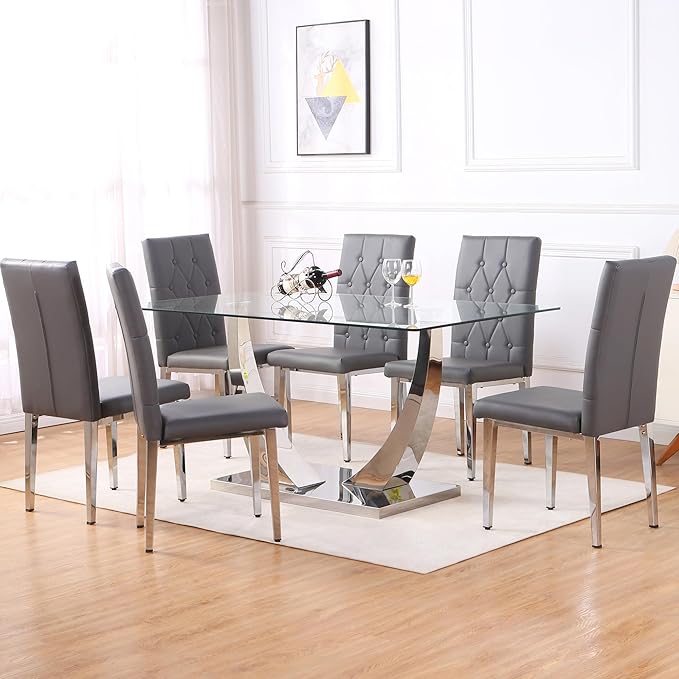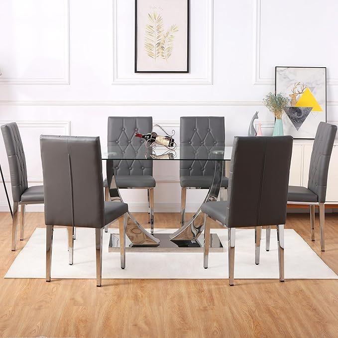 Modern Dining Table for 6, Glass & PU Leather 6-Chair Set, Silver U-Shaped Legs