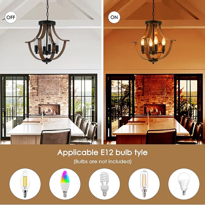 - 【E12 Base】The Farmhouse Style Kitchen Island Pendant Light uses 4 40-watt E12 base bulbs (bulbs not included) and is compatible with LED, CFL, halogen, or incandescent lighting. It is compatible with dimmable bulbs and switches (bulbs and switches not included). The different lighting effects shown in the pictures depend on the bulb you use. Farmhouse Chandelier 16-inch diameter, 14-inch high candle-style chandelier with adjustable hanging chain up to 78 inches long.